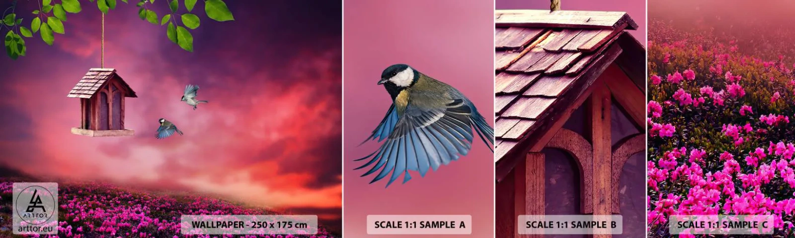 Amostra de Papel de Parede Standard Eco - Convite para jantar - Paisagem, Flores, Casa de passarinho - 100x30 cm