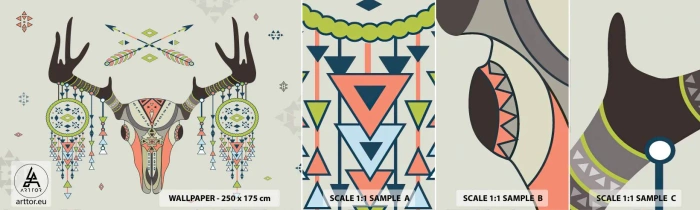 Amostra de Papel de Parede Standard Eco - Troféu de caçador indiano - Abstração, Cervo, Boho - 100x30 cm
