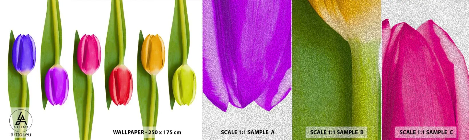 Amostra de papel de parede Premium Sand - Composição arco-íris - Flores, Tulipas, Natureza - 100x30 cm