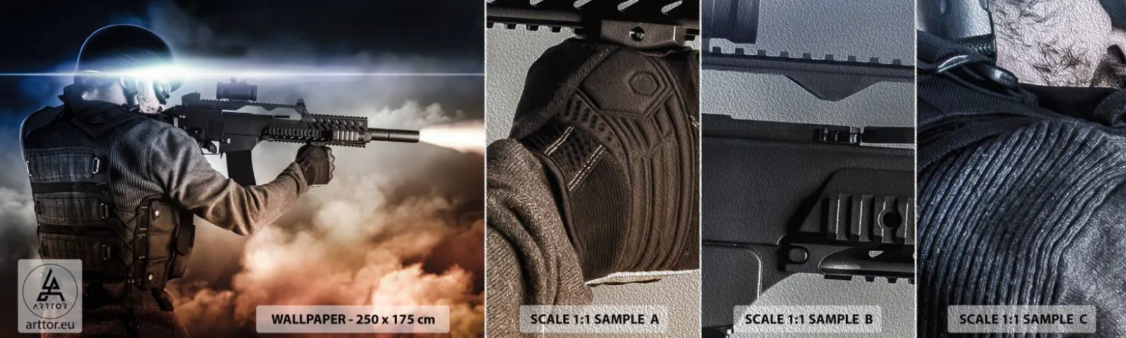 Amostra de papel de parede Premium Sand - Simplesmente um herói - Militares, Arma, Soldado - 100x30 cm