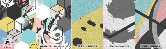 Amostra de papel de parede Premium Sand - Hexágonos e cubos em seis cores - Abstração, Pedaço, Padrão Moderno - 100x30 cm