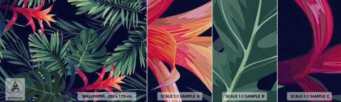 Amostra de papel de parede Premium Sand - Queimar em verde - Flores, Planta tropical, Folhas de palmeira - 100x30 cm