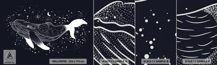 Amostra de papel de parede Premium Sand - No oceano do universo - Abstração, Baleia, Preto e branco - 100x30 cm