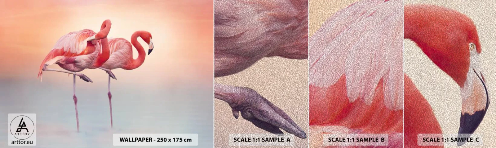 Amostra de papel de parede Premium Sand - Na cor do sol poente - Flamingos, Pássaros, Natureza - 100x30 cm