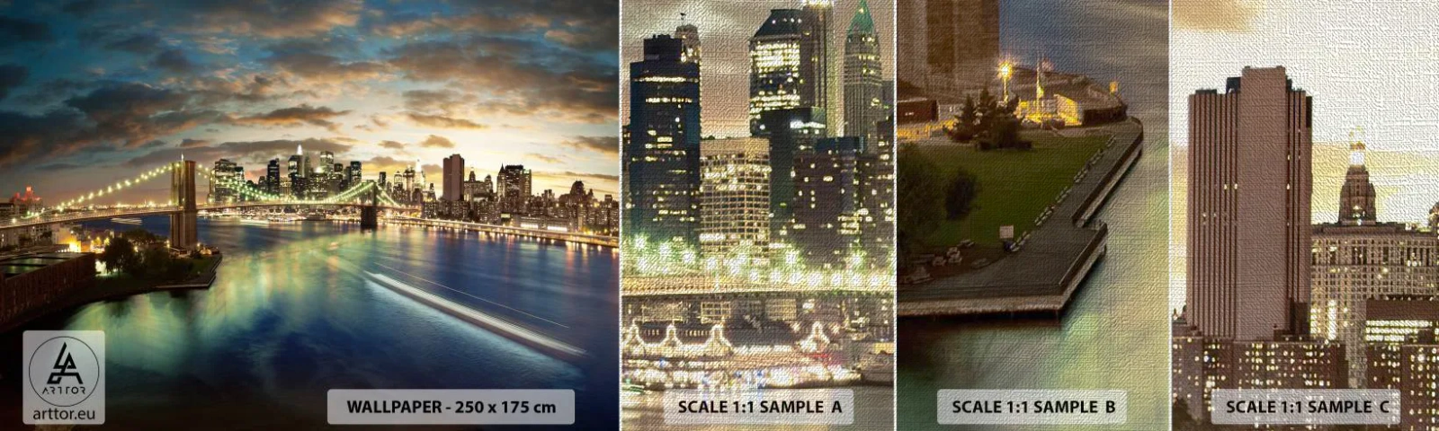 Amostra de papel de parede Premium Canvas - Uma noite bem iluminada em Manhattan - Cidade, Ponte, Nova Iorque - 100x30 cm