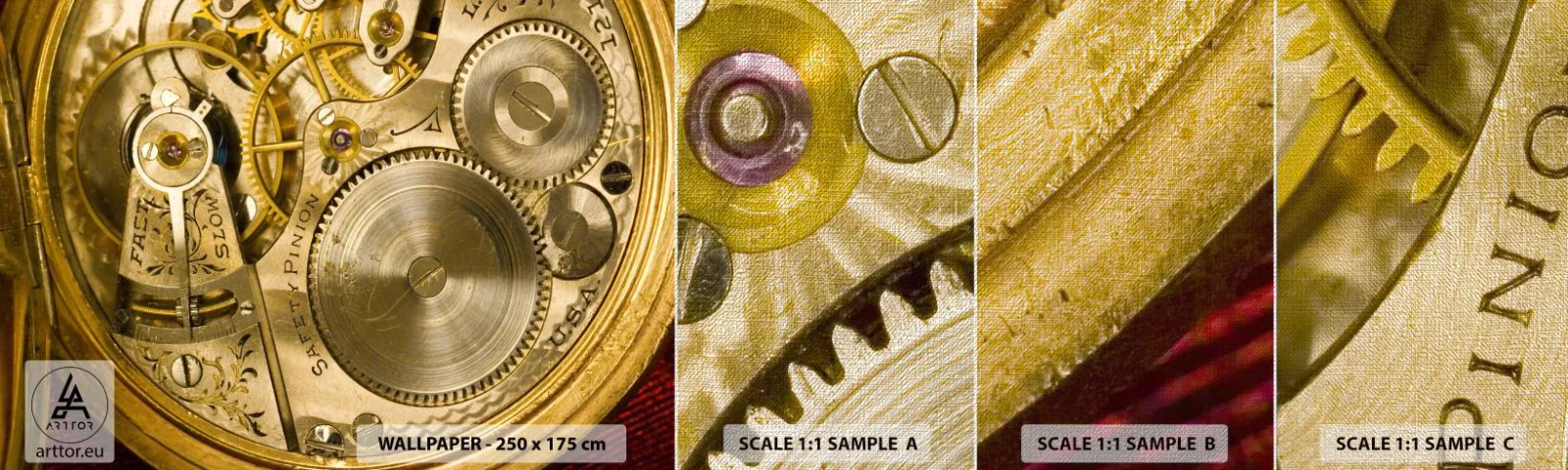 Amostra de papel de parede Premium Canvas - Mova-se com o tempo - Relógio, Mecanismo de Relógio, Vintage - 100x30 cm