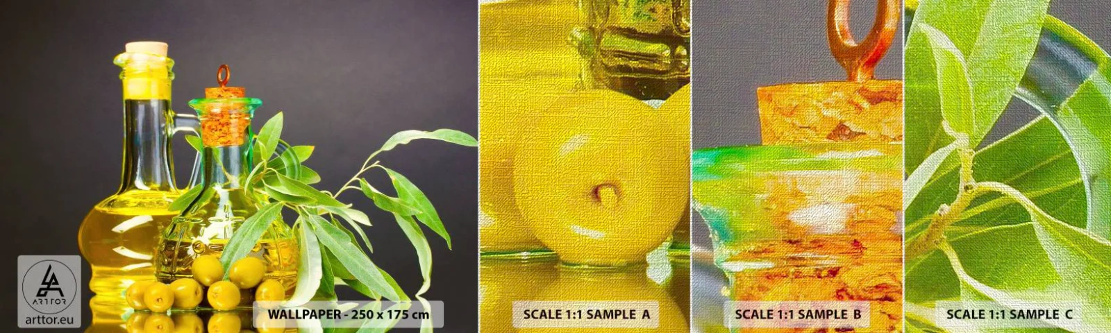 Amostra de papel de parede Premium Canvas - Natureza morta com azeitonas e azeite - Gastronomia, Azeitonas, Óleo - 100x30 cm