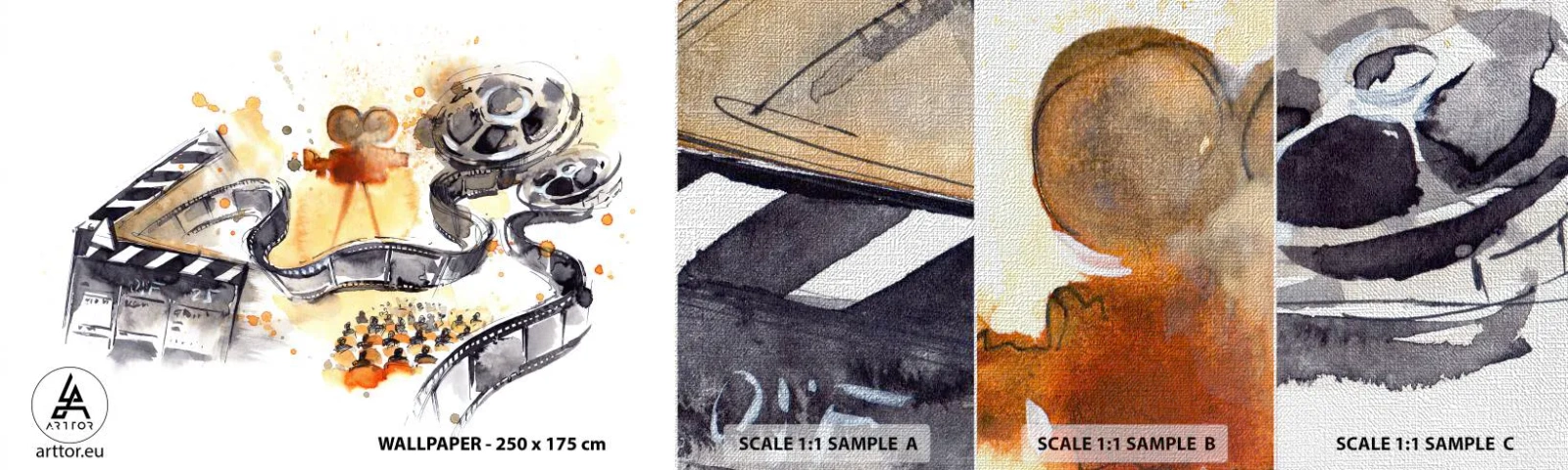 • Projetor de filme, Tira de filme, Cinematografia, Cultura, Música, Arte, Vintage e Retro, Para o escritório, Para o escritório, Para a sala de jantar, Para o hall, Para a sala de estar, Para o quarto, Branco, Preto, Laranja