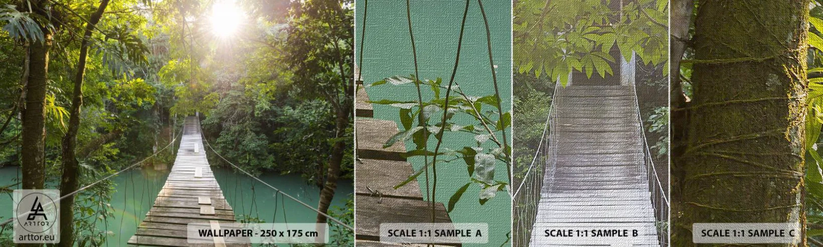 Amostra de papel de parede Premium Canvas - Da água azul para a floresta azul - Paisagem, Selva, Ponte de madeira - 100x30 cm