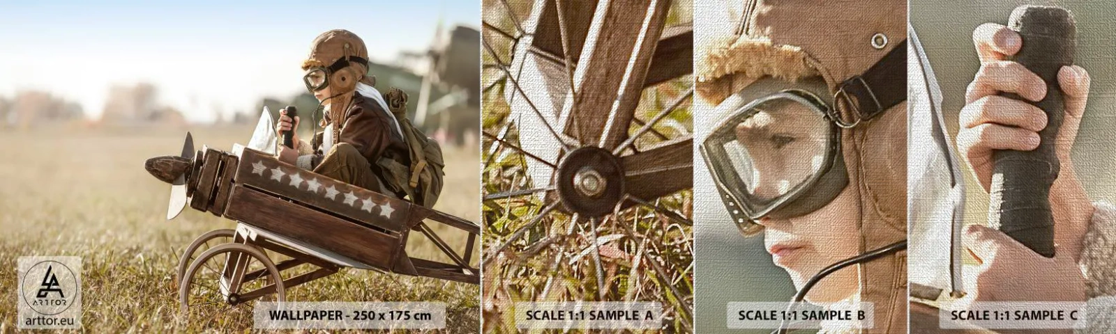 Amostra de papel de parede Premium Canvas - O início rumo a um sonho - Garoto, Avião, Vintage - 100x30 cm