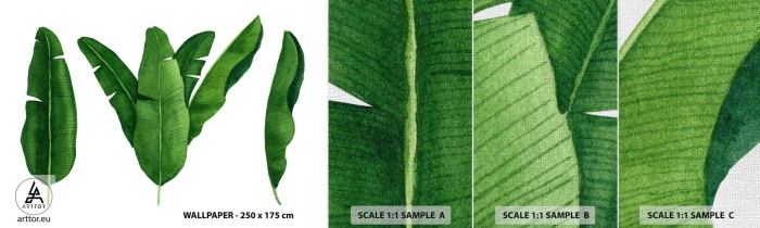 Amostra de papel de parede Premium Canvas - Simetria verde - Folha de banana, Tropical, Estilo Botânico - 100x30 cm