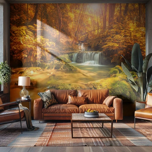 Papel de Parede Premium Canvas - Cascata na floresta em ouro - Paisagem, Cachoeira, Tailândia - 250x175 cm