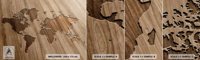 Amostra de papel de parede autocolante Deluxe Sticker - O mundo servido na mesa - Mapa mundial, Madeira, Continentes - 100x30 cm