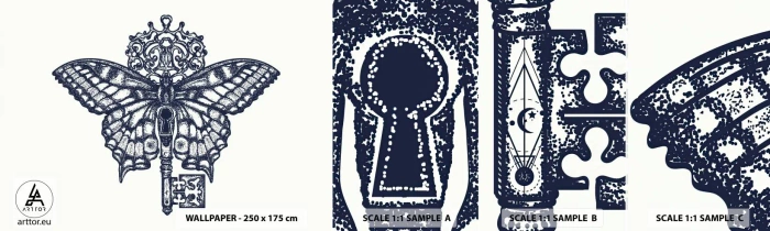 Amostra de papel de parede autocolante Deluxe Sticker - Todos os mistérios do coração - Abstração, Borboleta, Chave - 100x30 cm
