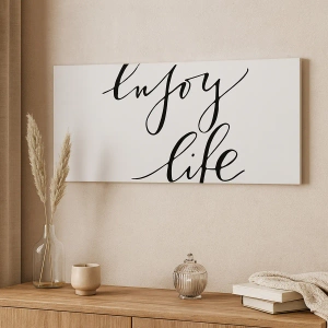- Uma impressão em tela moderna com a frase "aproveite a vida" em caligrafia elegante sobre fundo branco. Perfeita para interiores minimalistas e modernos, ela adiciona um toque inspirador.