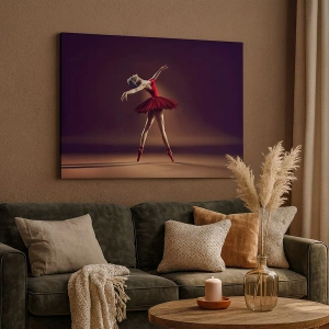 - Esta impressão em tela retrata uma bailarina de vestido vermelho contra um palco ao fundo. Perfeita para interiores que valorizam arte e elegância.