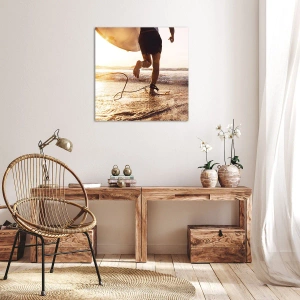 Quadro em tela - Um surfista corre pela praia com sua prancha sob o sol. - 70x50cm - Encontro das ondas - Decoração de parede moderna para a sala de estar e quarto ARTTOR