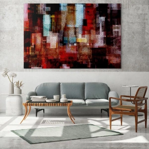 - A pintura retrata uma composição geométrica abstrata com tons dominantes de vermelho e preto. Detalhes estruturais e formas dinâmicas criam um design de interiores moderno e contrastante.