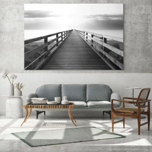 Quadro em vidro - Uma ponte de madeira que conduz ao horizonte em preto e branco - 70x50cm - Para longe... - Decoração de parede moderna para a sala de estar e quarto ARTTOR