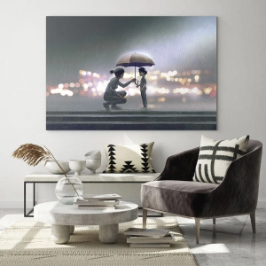 Quadro em vidro - Figuras na chuva com guarda-chuvas contra o fundo de luzes noturnas - 70x50cm - Está tudo bem agora - Decoração de parede moderna para a sala de estar e quarto ARTTOR
