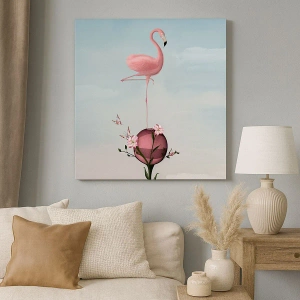 A pintura "Flamingo rosa equilibrando-se em uma bola de flores" é uma obra de arte que traz sutileza e elegância ao interior. Ela retrata um flamingo rosa equilibrando-se em uma bola decorada com flores delicadas. Esta composição, decorada em tons pastel, combina motivos da natureza com uma expressão artística surreal. O fundo azul enfatiza ainda mais a harmonia e a leveza de toda a obra.