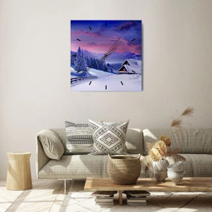Relógio de parede - Relógio em vidro - Paisagem de inverno com uma casa de campo nas montanhas ao pôr do sol - 30x30cm - Noite silenciosa - Decoração de parede moderna para a sala de estar, cozinha e quarto ARTTOR