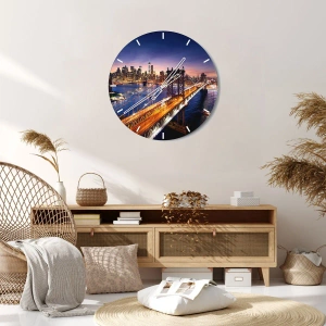Relógio de parede - Relógio em vidro - Vista noturna de Manhattan e da ponte - 30x30cm - Uma ponte luminosa para o coração da cidade - Decoração de parede moderna para a sala de estar, cozinha e quarto ARTTOR