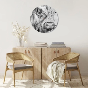 - Um close-up do rosto de um gado escocês, renderizado em preto e branco. Este relógio redondo, feito em vidro, mede 30x30 cm. É perfeito para interiores rústicos e modernos, com um toque de natureza.