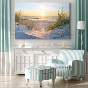 Quadro em tela - Uma praia de areia com vista para o pôr do sol sobre o mar - 70x50cm - O som do mar, o canto dos pássaros, a praia selvagem entre a relva... - Decoração de parede moderna para a sala de estar e quarto ARTTOR