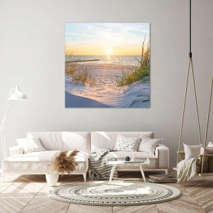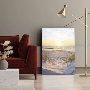 A transição das dunas para o mar é rica em detalhes - pegadas na areia, sombras delicadas da grama e o reflexo da luz na água enfatizam a beleza natural desta paisagem. A imagem atrai o olhar e cria uma atmosfera de paz e harmonia, ideal como decoração de interiores.