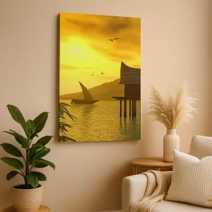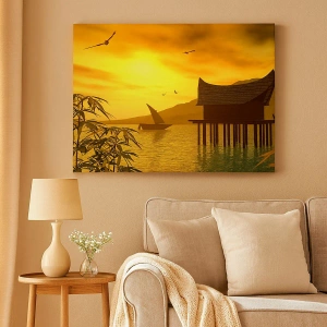 Quadro em tela - Pôr do sol tropical sobre a água com uma casa de madeira sobre palafitas. - 70x50cm - A desejada paz - Decoração de parede moderna para a sala de estar e quarto ARTTOR