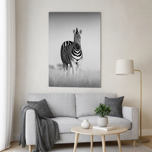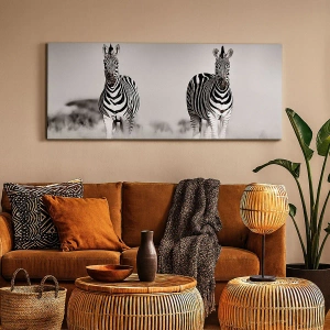 - A tela "E, no entanto, o mundo é preto e branco" retrata duas zebras em pé na savana em estilo monocromático. É a decoração perfeita para interiores modernos e minimalistas.