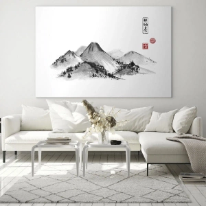 - Esta pintura em vidro de 70x50 cm retrata uma paisagem montanhosa minimalista em estilo oriental. A composição monocromática traz paz e harmonia ao interior.