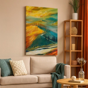 A tela é esticada na moldura. Os lados e bordas são impressos para criar uma continuação da imagem. O quadro está pronto para ser pendurado na parede. Cada produto tem um gancho ligado à moldura e um conjunto de montagem (parafuso + cavilha).