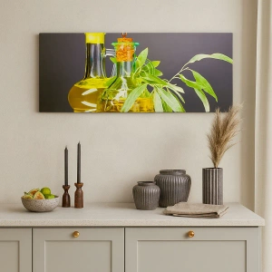Quadro em tela - Garrafas de azeite e ramos de oliveira - 70x50cm - Natureza morta com azeitonas e azeite - Decoração de parede moderna para a sala de estar e quarto ARTTOR