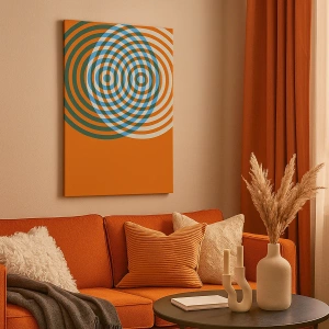 - Este design moderno apresenta círculos concêntricos sobre um fundo em tons de laranja, azul e verde. Perfeito para interiores modernos e minimalistas.