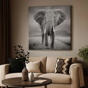 - Um elefante imponente na savana africana em tons monocromáticos. Esta imagem expressiva é perfeita para interiores que enfatizam o poder e a elegância da natureza.