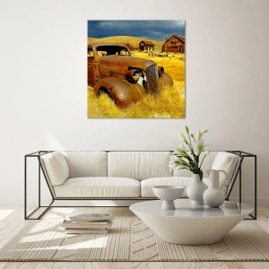 Quadro em vidro - Um carro antigo com uma vila deserta ao fundo - 70x50cm - Um merecido descanso - Decoração de parede moderna para a sala de estar e quarto ARTTOR