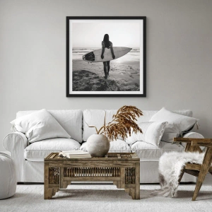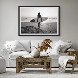 - Este pôster retrata uma mulher com uma prancha de surfe em uma praia ao pôr do sol. Este design em preto e branco é perfeito para interiores elegantes e modernos. O conjunto inclui uma moldura preta medindo 50x70 cm.