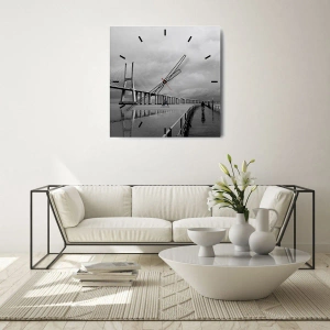 O relógio é feito de vidro de 4mm de espessura. A tecnologia de relógio está em conformidade com a classe de segurança 2B2 de acordo com a norma PN-EN 12600:2004, o que garante resistência ao impacto. O relógio em vidro está pronto para ser pendurado – possui um gancho de metal montado na parte de trás do relógio e um espaçador de espuma, que regula a distância uniforme entre o relógio e a parede. O relógio tem um mecanismo de fluxo silencioso alimentado por uma bateria de 1,5 V - bateria AA (a bateria não está incluída).