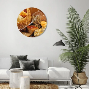 Relógio de parede - Relógio em vidro - Uma composição de pão e cereais em uma cesta rústica - 30x30cm - Safamo-nos novamente - Decoração de parede moderna para a sala de estar, cozinha e quarto ARTTOR
