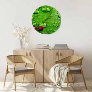 Relógio de parede - Relógio em vidro - Joaninhas em uma folha com gotas de água - 30x30cm - Reunião em verde - Decoração de parede moderna para a sala de estar, cozinha e quarto ARTTOR