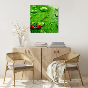 - Uma fotografia macro de joaninhas em uma folha coberta de gotas d'água. Um motivo natural que traz frescor e harmonia a qualquer ambiente.