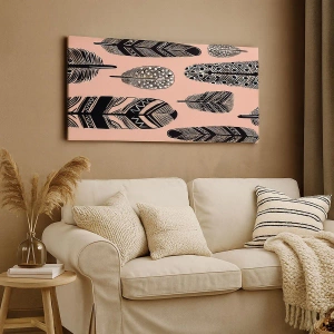 A impressão em tela "Penas decorativas em fundo claro" é uma decoração de parede sutil e elegante que chama a atenção com seu padrão único. Ela retrata penas pretas e brancas dispostas sobre um fundo rosa pastel, criando uma composição harmoniosa e elegante. Cada pena se destaca com seu padrão geométrico único, conferindo à imagem um caráter artístico e singular.