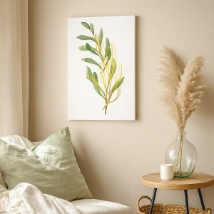 A impressão em tela "Tudo o que é Bom" é uma decoração sutil que combina simplicidade natural com design moderno. O elemento central é um galho verde decorado com folhas delicadas, destacando-se sobre um fundo claro. Esta composição exala paz e harmonia.