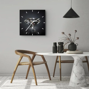O relógio é feito de vidro de 4mm de espessura. A tecnologia de relógio está em conformidade com a classe de segurança 2B2 de acordo com a norma PN-EN 12600:2004, o que garante resistência ao impacto. O relógio em vidro está pronto para ser pendurado – possui um gancho de metal montado na parte de trás do relógio e um espaçador de espuma, que regula a distância uniforme entre o relógio e a parede. O relógio tem um mecanismo de fluxo silencioso alimentado por uma bateria de 1,5 V - bateria AA (a bateria não está incluída).