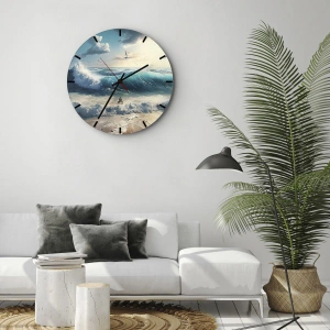 Relógio de parede ""Rushing only for you"" captura a beleza e o poder da natureza, retratando ondas do oceano batendo na areia. A água bate na costa em meio à espuma, e os tons turquesa contrastam com a areia delicada e a luz do céu. É uma paisagem pictórica cheia de emoção e movimento que transporta você para uma atmosfera litorânea.
