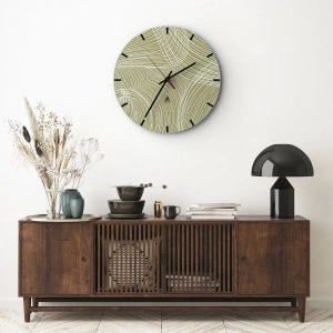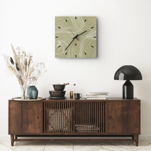 O relógio é feito de vidro de 4mm de espessura. A tecnologia de relógio está em conformidade com a classe de segurança 2B2 de acordo com a norma PN-EN 12600:2004, o que garante resistência ao impacto. O relógio em vidro está pronto para ser pendurado – possui um gancho de metal montado na parte de trás do relógio e um espaçador de espuma, que regula a distância uniforme entre o relógio e a parede. O relógio tem um mecanismo de fluxo silencioso alimentado por uma bateria de 1,5 V - bateria AA (a bateria não está incluída).