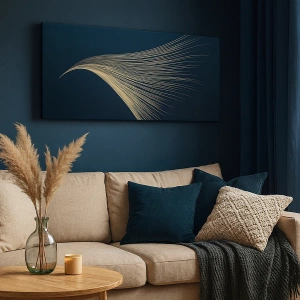 - A pintura apresenta uma linha delicada semelhante a uma pena sobre um fundo azul-marinho, criando uma composição elegante e minimalista. Perfeita para interiores que valorizam sutileza e harmonia.