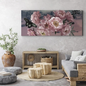 - Esta pintura retrata peônias cor-de-rosa rodeadas por folhas delicadas, com uma borboleta preta sobre um fundo de delicados tons pastel. Um complemento perfeito para interiores românticos ou clássicos, traz harmonia e elegância a qualquer espaço.
